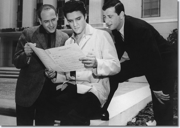 A publicity photograph with Mike Stoller, Elvis holding some sheet music for 'Jailhouse Rock' and Jerry Leiber |