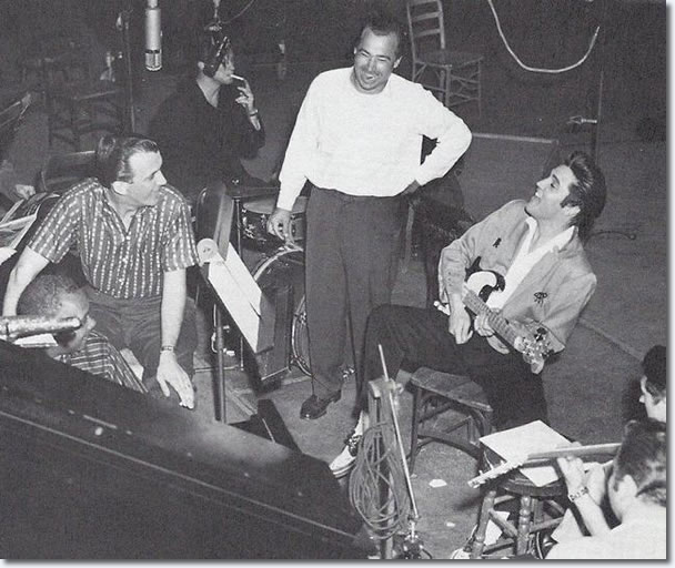 Dudley Brooks at the piano, Hugh Jarrett, Bill Black, Elvis holding electric bass and Scotty Moore on guitar |