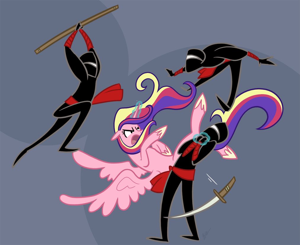 Things to point out – The Mane 6 have weird hairstyles (looking forward to the episode Rainbow Dash turns into Elvis Presley), the eye highlights are hexagonal on Twilight, Applejack, Rainbow and Fluttershy, but not for Rarity or Pinkie Pie (still all have those DEATHLY STARES), and Cadance is very sparkly. Rockin’.
